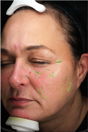 Images show results from an independent study conducted by Cutest. Green lines represent wrinkles using Canfield Scientific facial analysis. Images are unretouched and taken under consistent lighting and positioning. Results shown are after 8 weeks of use as directed.